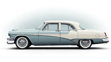An elegant vintage automobile is depicted in profile, showcasing its classic design. The car displays a two-tone color scheme with smooth lines and chrome accents. Set against a white backdrop, the image emphasizes the vehicle's form. This illustration can be used for projects in automotive, history, and design contexts.
