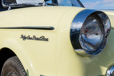 Classic vintage old car on a street display. Retro car parked in old city street. Nobody, close up-Vancouver Canada-April 1, 2023