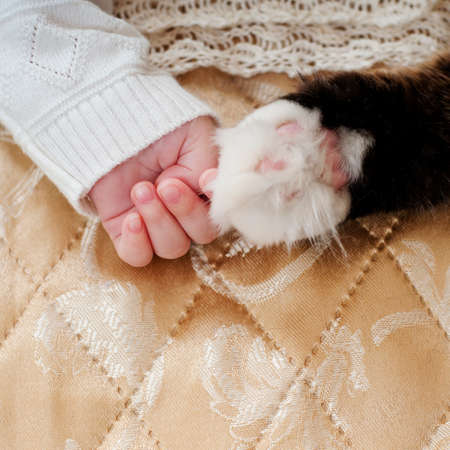 cat's paw in a mans palm. human to lend a helping hand. focus on a edge of cats paw