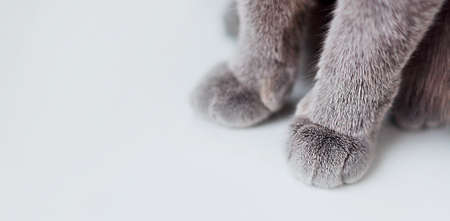 Banner about Pets, white background gray paws of a cat. Paws of a British cat with short hair close-up.