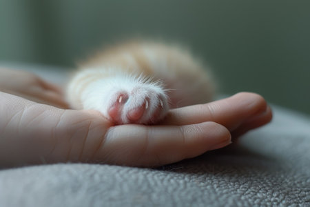 A kitten is resting its paw on a person's hand. Concept of warmth and tenderness, as the kitten is being held and cared for by the person