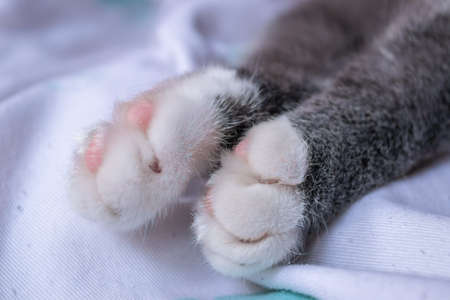 Cute tabby cat sleeping on a pillow. Close-up of paws. Selective focus.