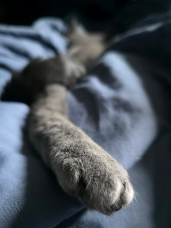 A close-up of a soft grey cat paw reaching toward the camera, resting on a blue sheet. Cozy moment that conveys warmth and comfort.