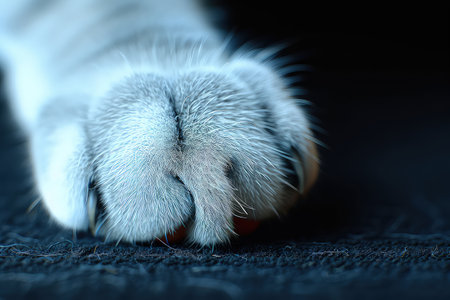 A close-up view of a fluffy cats paw resting on sparkling surfaces during twilight hours