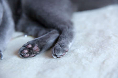 Two paws of blue british shorthair kitten. Hind legs of gray cat is lying on bed