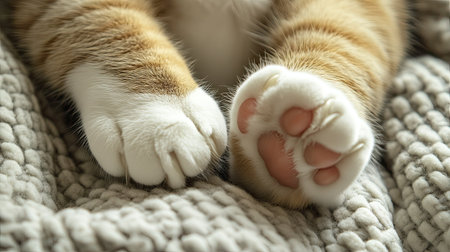 A close-up of a fat cat's paws as it kneads a soft blanket, its chunky legs and gentle movements highlighting the comforting behavior.