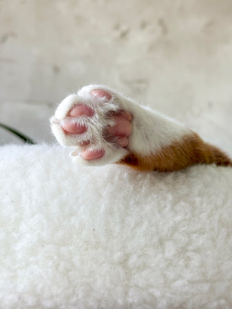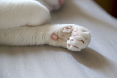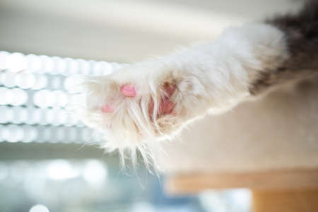 Fluffy paw of a white cat on a white background. Atmospheric photo of comfort and warmth