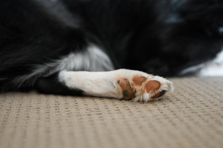 Macro shoot of beagle dog paw feet and nails blurry head in background