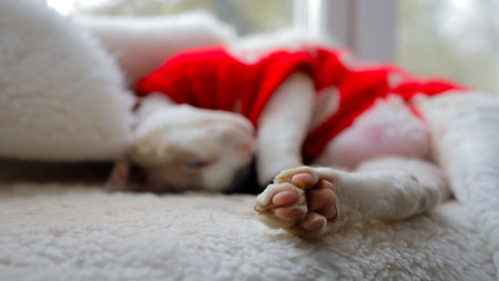 An adorable white Devon Rex kitten is napping in a red sweater on a windowsill, curled up with its little paws extended.