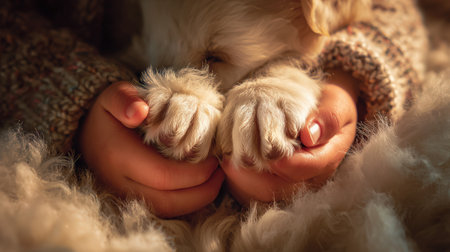 A child's small hands gently hold a puppy's fluffy paws, capturing innocence and trust in warm morning light. This lifestyle photo exudes realism and tenderness.