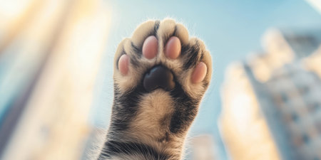 Close up of a cat's paw raised against an urban skyline under sunlight.