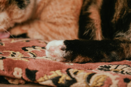 Close up of sleeping cat paws to show concept of a cozy home, staying home with pets and coping with home quarantine due to the covid-19 pandemic