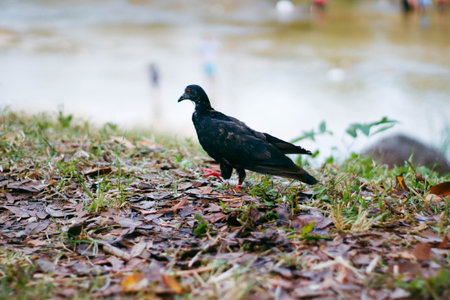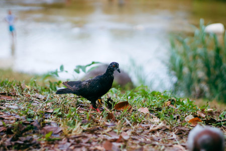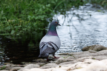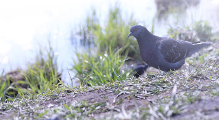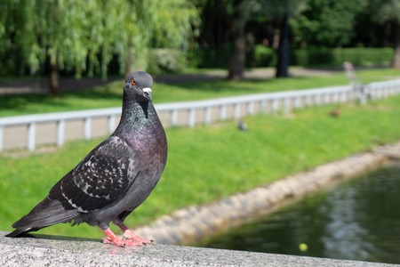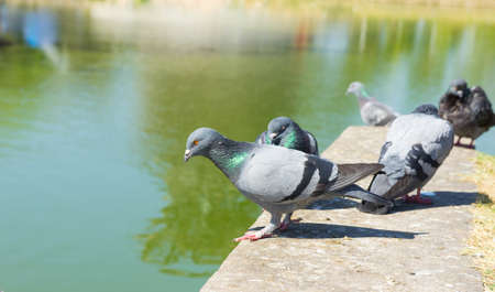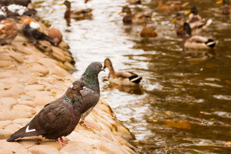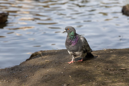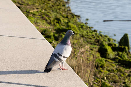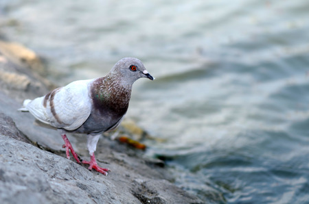 Pigeon standing on the bank of the river, close-up
