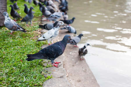Old rock dove pecking on the foods on the concrete ground construction near the water stream.