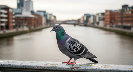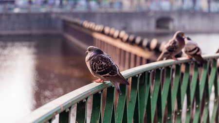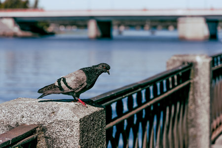 Wild gray pigeon sits on the fence of the city embankment next to the pond river, birdwatching wildlife
