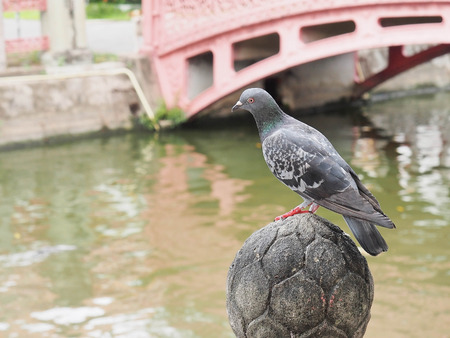 Pigeon was stand on the craved stone beside canal in White Temple