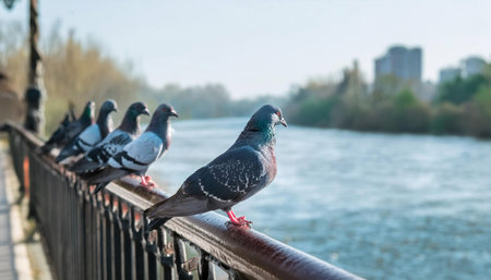 Pigeons on ebankment of the river Dnieper in Kremenchug, Ukraine