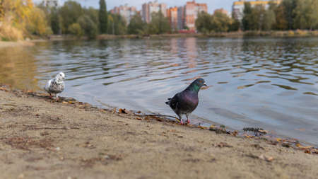 Two pigeons stand in the water on the shore of a lake within the city. The bird looks directly into the camera. Multi-storey houses in the background. Autumn city landscape.