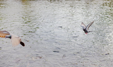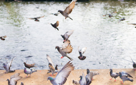 Flock of pigeons on a lake in a park