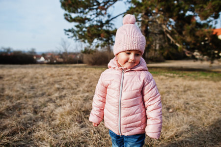 Baby girl, wear pink jacket walking at Valtice park, Czech Republic.