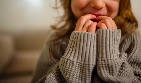 a little girl in a warm hat on his head smiled. the concept of childhood, health, IVF, cold time