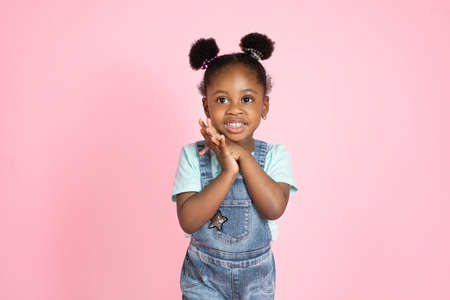 Happy laughing black skinned little girl in casual wear, jeans overalls, looking at camera, holding hands together. Little child with afrohair on pink studio background.