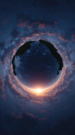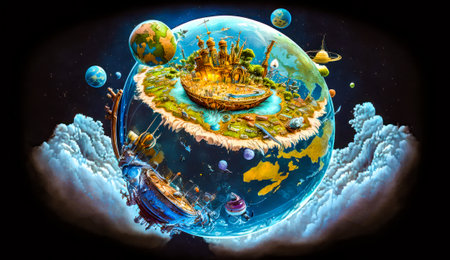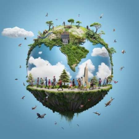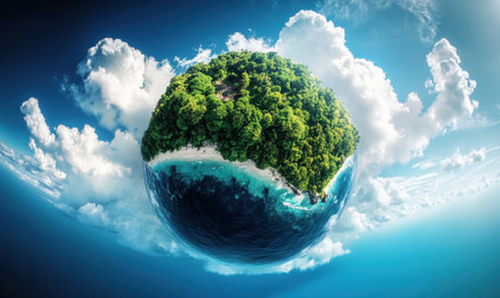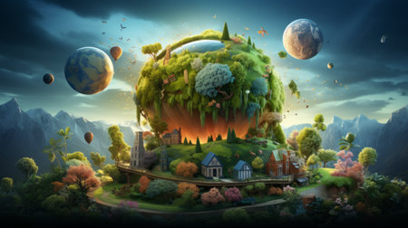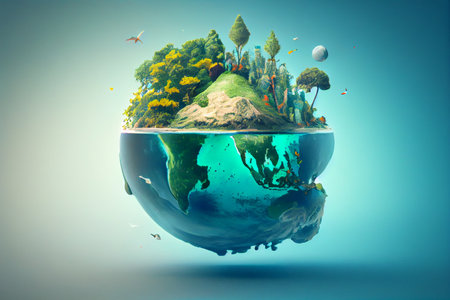 Miniature Earth, diverse landscape, floating clouds, birds, environmental concept