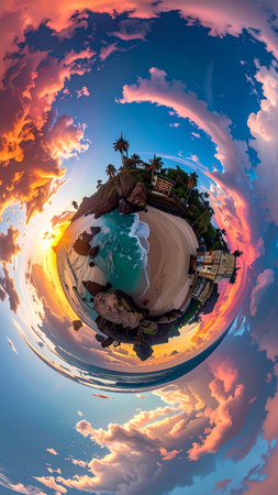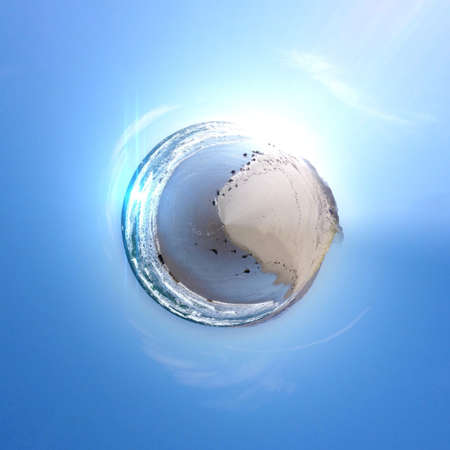 Little planet transformation of spherical panorama 360 degrees. Spherical abstract aerial view of beautiful tropical beach with palm trees, blue sea and houses. Curvature of space.