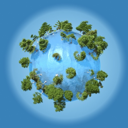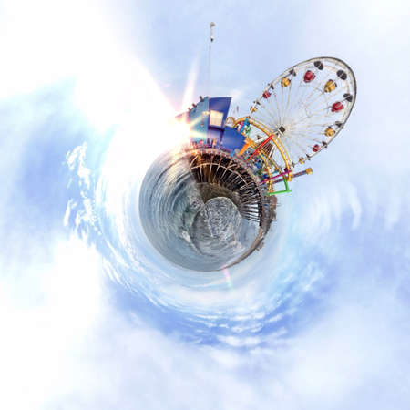 Little planet with amusement park, trees and cold blye sky. Nice background.