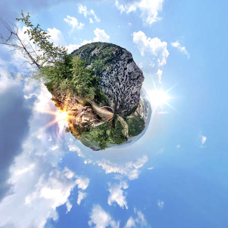 Stereographic projection of Carpathian mountains. Ukraine. 360 degree panorama. Globe panorama.