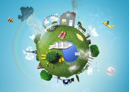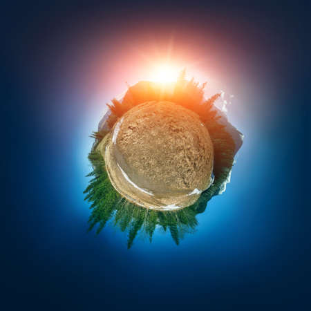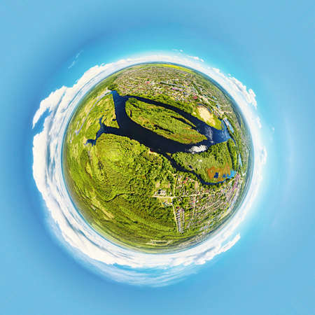 Spherical landscape in the form of a round the world. Collage method. Lake and forest