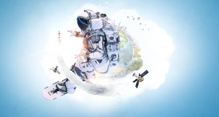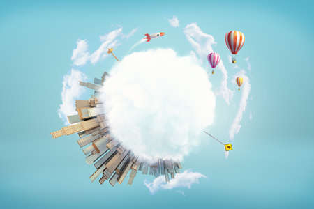 3d rendering of cloud-covered Earth globe with big modern city and road signs and space rocket and hot-air balloons in the air.