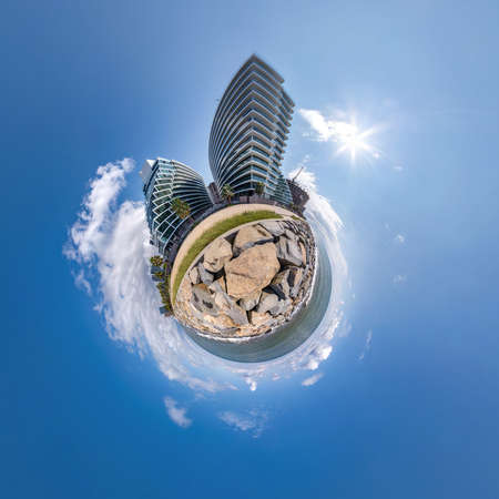 tiny planet in evening sky in city center near modern skyscrapers near sea coast. Transformation of spherical 360 panorama in abstract aerial view.