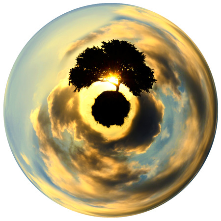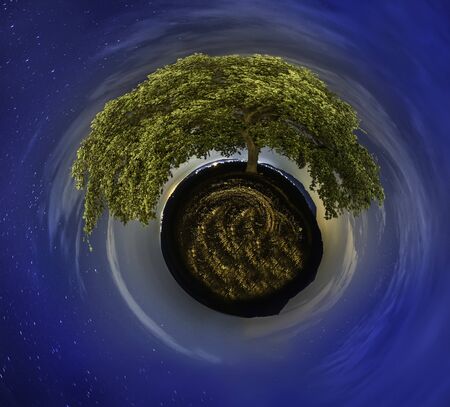 Planet with a lonely oak tree on a starry night sky, Dobrogea, Romania
