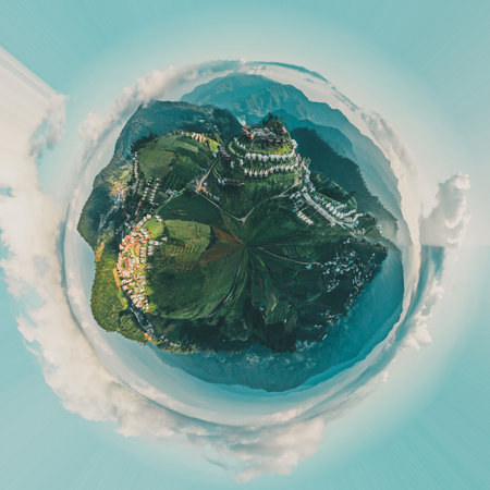 Little planet 360 degree sphere. Panorama of aerial view of Ban Rak Thai village, chinese hotel resort, Mae Hong Son, Thailand. Nature landscape in travel trip and vacation.