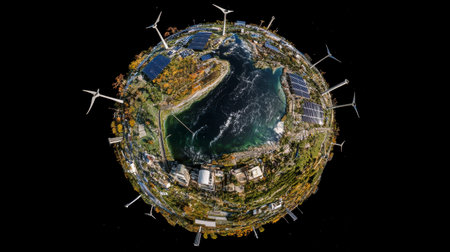 A spherical representation of Earth covered in diverse landscapes, featuring wind turbines suggesting sustainable energy. The image is set against a black background, enhancing the contrast and highlighting the intricate details of the planet's surface.
