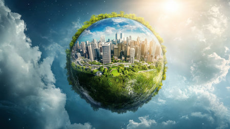 A stunning view of a green globe juxtaposed with a vibrant city skyline, symbolizing the balance between urban life and nature's beauty.