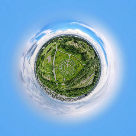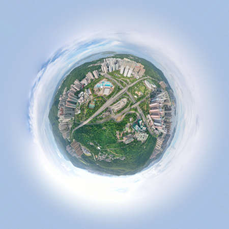 tiny planet in blue sky with clouds in city center near modern skyscrapers or office buildings. Transformation of spherical 360 panorama in abstract aerial view.
