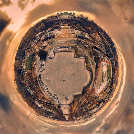 Full aerial view panorama 360 degrees of Kyiv city, Grishka Botanical Garden. spherical panoramic view, Small globe Kiev