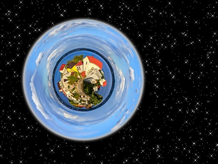 A spherical panoramic view creating a tiny planet effect with houses, trees, and sky.
