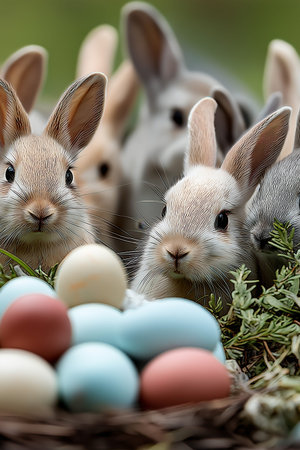 Baby bunnies peeking from behind a nest filled with colorful Easter eggs, celebrating spring. Cute baby bunnies gathering around pastel Easter eggs