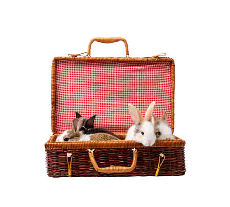 Four Rabbits baby bunny sitting in brown wicker suitcase, isolated on white background
