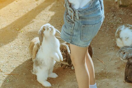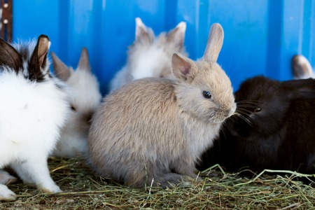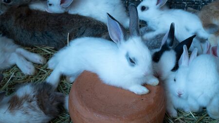 Group of cute rabbits living in farm. Rabbits are mammals of the order Lagomorpha. There are about fifty different species of rabbits and hares.