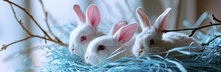 Three adorable white baby bunnies snuggled together in a nest of blue Easter hay. A tranquil scene.