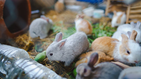 Rabbit innocent curious concept. A lively group of rabbits foraging in their cozy habitat, surrounded by hay and greenery.
