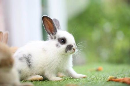 Cute little rabbit on green grass with natural bokeh as background during spring. Young adorable bunny playing in garden. Lovely pet at park with baby carrot as food.