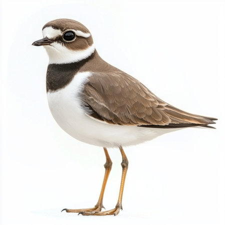 semipalmated plover stands elegantly by the water, its brown and white feathers contrasting beautifully against a soft white background, highlighting its delicate features.