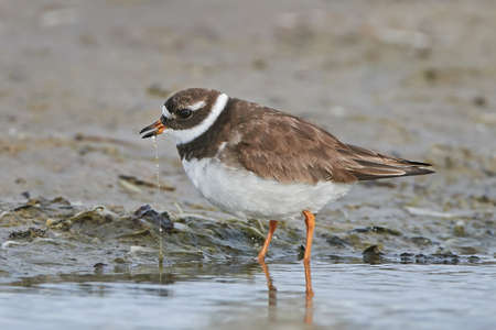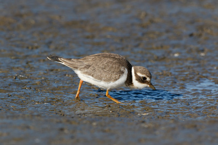 Foraging spring migrant Common ringed plover Charadrius hiaticula at stop-over inspecting muddy bottom for prey. Ghadira Nature Reserve, Malta