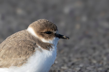 Closeup of a juvenile Little ringed plover, Charadrius dubius, foraging on the floor
