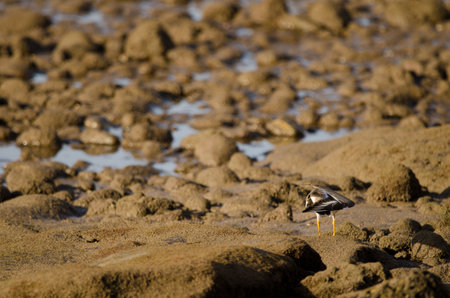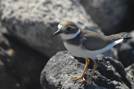 Closeup of Semipalmated Plover shorebird walking on rocks at low tide